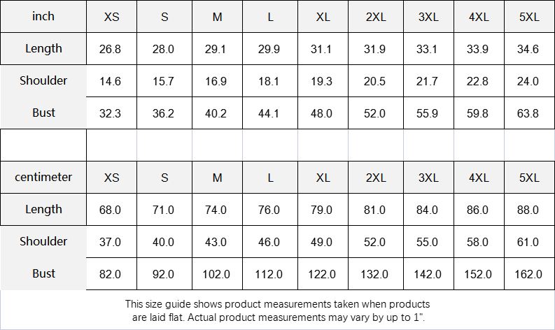 | inch | XS | S | M | L | XL | 2XL | 3XL | 4XL | 5XL |